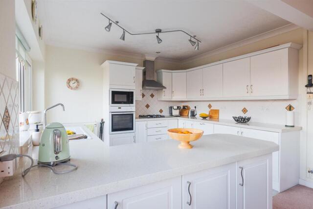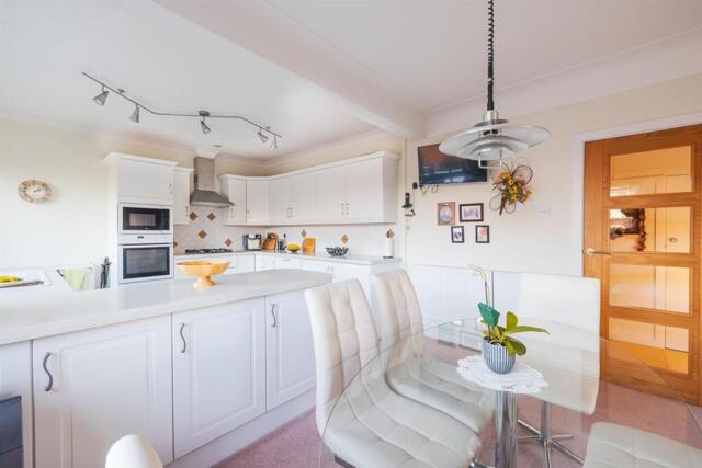 The accommodation begins with a welcoming entrance hall, leading to a useful WC cloakroom and a bright, well-proportioned lounge featuring a focal fireplace and large front-facing windows. Sliding glazed doors connect the lounge to a sun room, creating an excellent additional living space with views over the garden. The heart of the home is the modern open-plan kitchen diner, fitted with a comprehensive range of wall and base units, integrated appliances and a breakfast bar, ideal for both everyday living and entertaining.