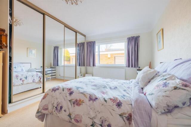 To the right of the property are two double bedrooms, both enjoying a pleasant outlook over the front or rear garden, along with a contemporary family bathroom finished with tiled walls and flooring and a double walk-in shower. A loft room provides excellent storage and is currently used as a third bedroom, offering further flexibility.