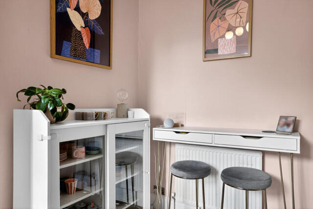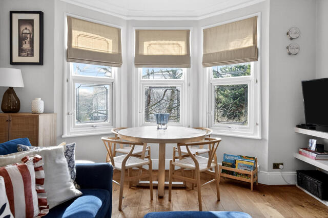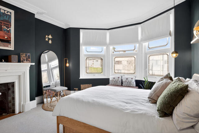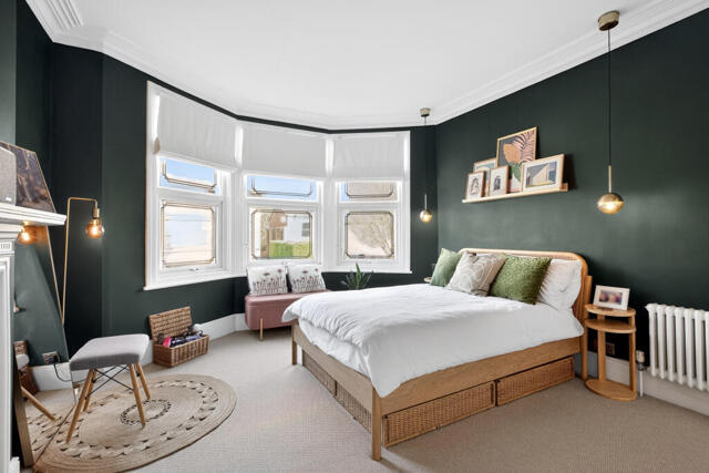 There are two well-proportioned bedrooms, including a generous principal bedroom with a further period fireplace and bay window. The second bedroom is ideal as a guest room, nursery, or home office. A stylish contemporary bathroom, finished in clean modern tones, completes the accommodation.