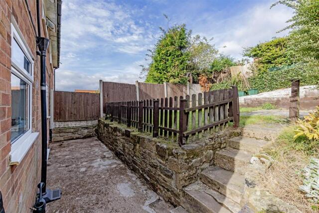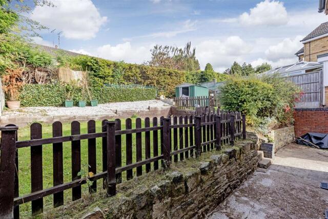 Good sized rear enclosed gardens with side wrought iron secure gate and concrete low maintenance patio area. Low level stone walling with steps to the upper lawn with ranch style fencing. Further stone patio area. Garden shed.