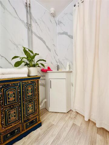 Family Bathroom - A side aspect room approached down the steps, off the landing area, with an obscure wooden double glazed window, wooden flooring, ceiling light, radiator. Suite comprising low level wc with hidden cistern, vanity unit incorporating the wash hand basin and a hidden enclosed and tiled bath area, with a mains shower sytem.