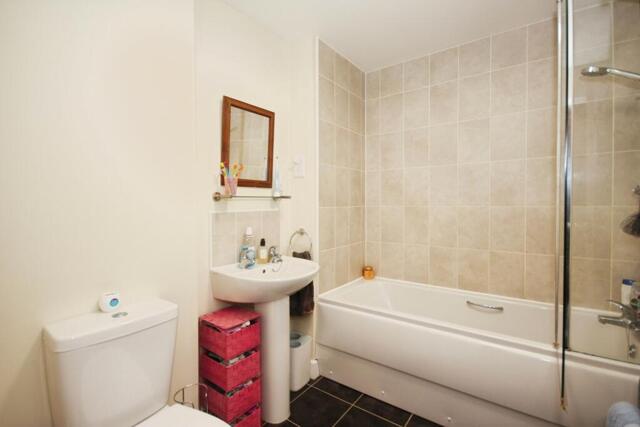A modern family bathroom fitted with a three piece suite including bath with shower, WC, and wash basin.