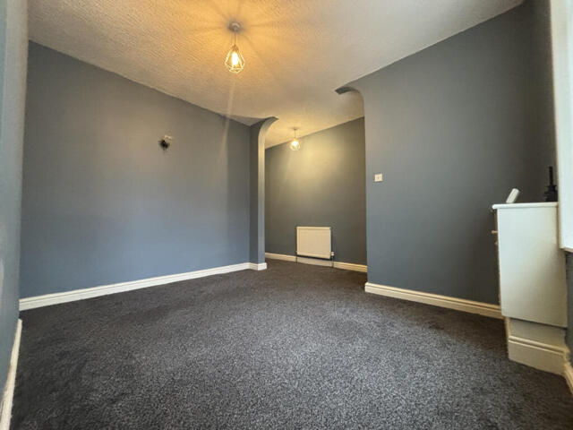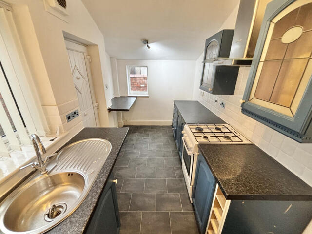 Two UPVC double glazed windows, fitted with a matching range of base and wall units, oven with four ring gas hob and extractor hood over, space for fridge freezer, plumbing for washing machine, radiator, door providing access to rear yard.