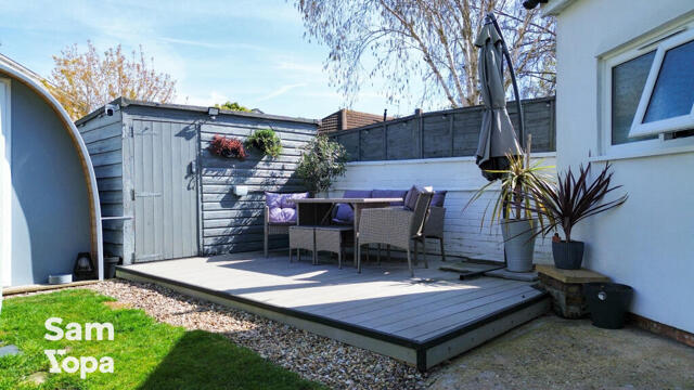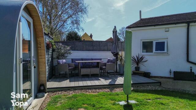 Externally, the rear garden is fully enclosed and designed for both relaxation and entertaining, featuring a lawned area, raised decking space, and secure side access. A fully powered garden pod provides a versatile space, ideal for home working or hobbies. The property also includes allocated parking for one vehicle via a shared driveway.