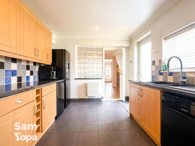 Internally, the home features a spacious open-plan living and dining area, complete with built-in storage and a staircase leading to the first floor. The kitchen is generously sized, offering ample cupboard space, room for appliances, tiled flooring, and direct access to the rear garden. The ground floor is further complemented by a contemporary bathroom suite, fully tiled and fitted with a P-shaped bath and overhead shower.