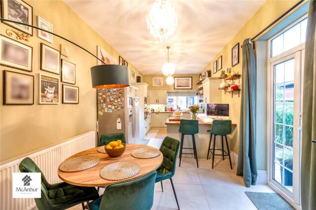 To the front of this impressive home you are met with a generous walled and gated driveway. Wandering down the drive, you are presented with a large bay window, and the entrance porch topped with ornate detailing. The bespoke front door is handmade, showcasing the beautiful original stained glass window. Moving down the side of the home, you are invited onto the well maintained, landscaped garden, boasting a patio, flower beds, mature shrubbery, and access out to a gated passageway. The rear also presents a spacious garage/workshop, and an outdoor storage room. The patio welcomes you through double doors into the kitchen/diner.