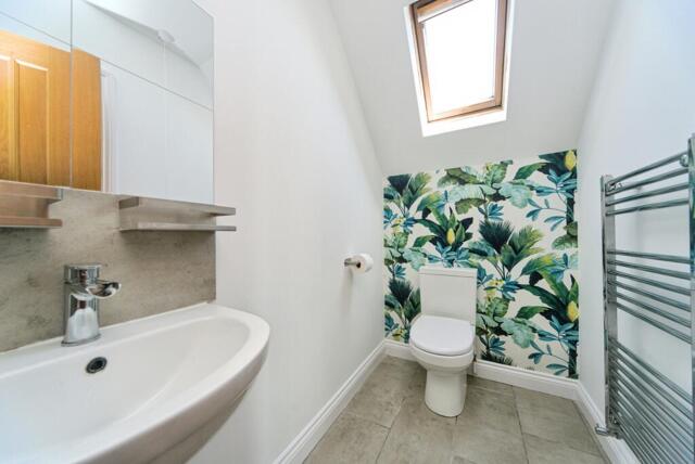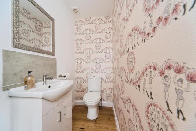Cloakroom: Vanity washbasin with splashback and mixer tap, low-level WC, and chrome towel radiator.