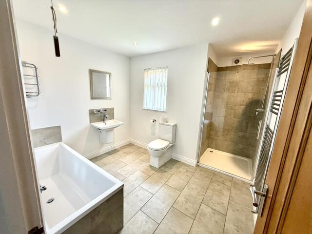 Family Bathroom: Large luxury bathroom with walk-in shower, double-ended bath with mixer tap, vanity washbasin, and low-level WC.Tiled floor and chrome towel radiator.