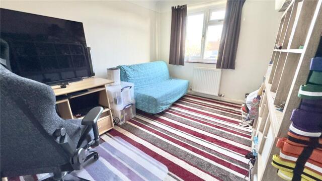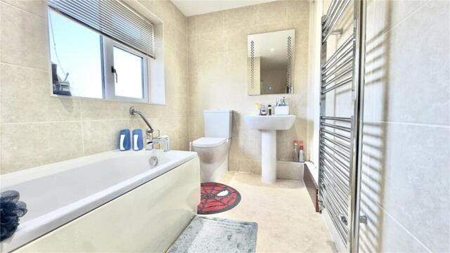 To the first floor, there are three generously sized double bedrooms, two of which benefit from built-in wardrobes. The bedrooms are served by a spacious four-piece family bathroom.