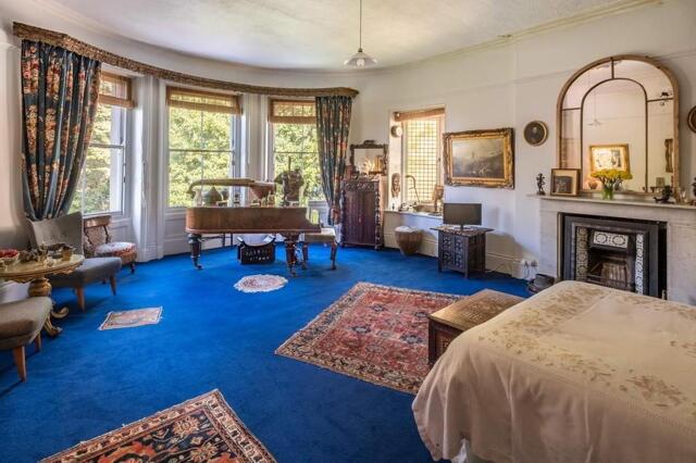 Feature fireplace. Corniced ceiling. French doors leading to the balcony with views across town. Door to: