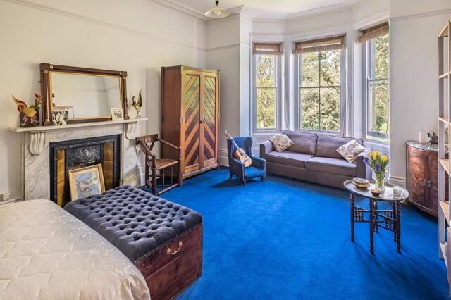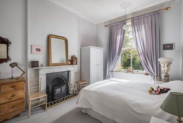 The master bedroom with triple sash bay window to the rear. Oriel window to the side. Marble fireplace. Two cast iron radiators. Corniced ceiling. Picture rail.