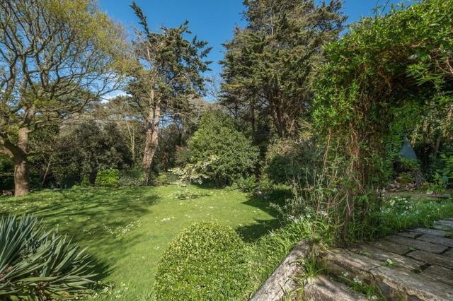 Walled frontage with gates. Lawn area and wealth of trees and shrubs. Raised beds. Access to rear garden.