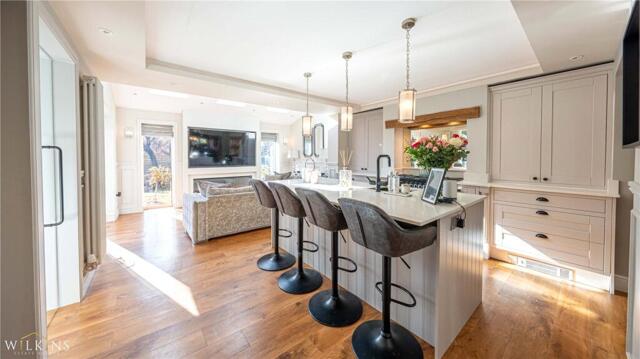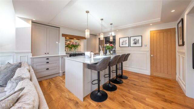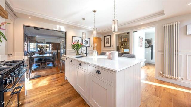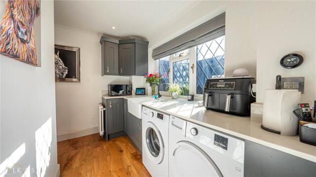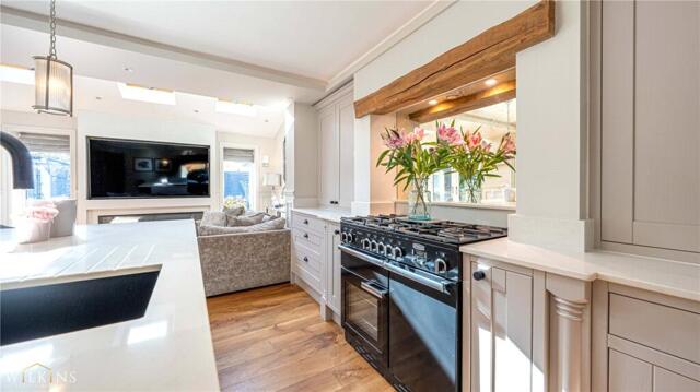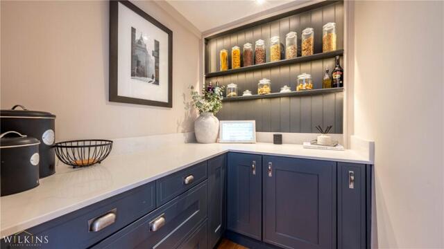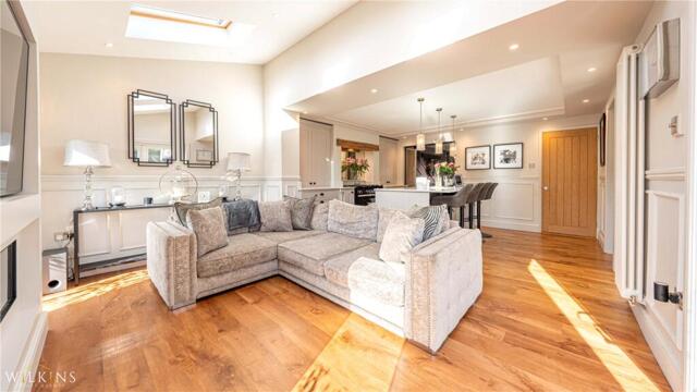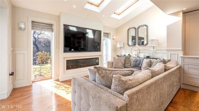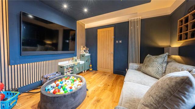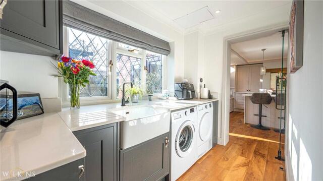 The ground floor is where this property really shines, featuring a stunning open-plan kitchen/dining extension to the rear, complete with a beautifully finished contemporary kitchen, high spec fittings, and an abundance of natural light from skylights and elegant glass doors, creating a luxurious and airy feel. Additional downstairs space includes a cosy snug room ideal for relaxing, a separate reception room created from a garage conversion, perfect as a home office or playroom, and a convenient downstairs WC. A practical utility room and pantry provide excellent additional storage, while the spacious lean-to at the side offers further versatility.