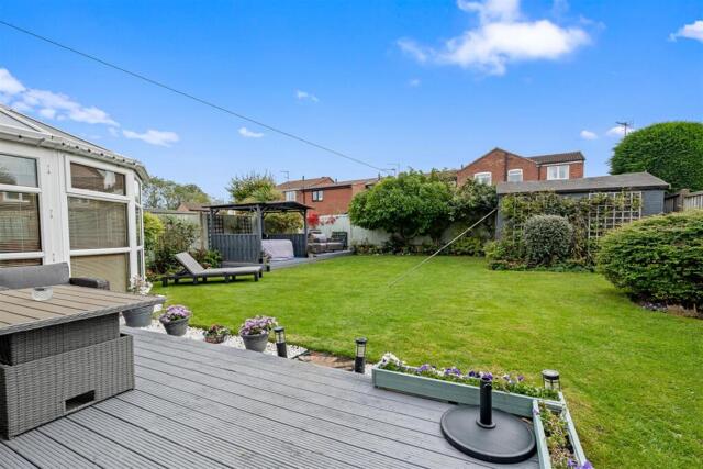Outside, the well maintained garden offers a generous lawn area, decked seating area plus multiple seating areas and a large shed, providing ample storage.