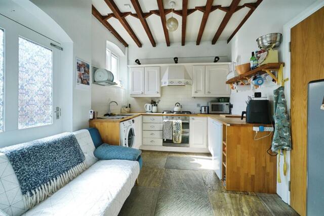 Having a range of matching base and wall units with beech block worksurfaces over, single drainer stainless steel unit with chrome mixer tap over, plumbing and space for an automatic washing machine, integrated electric oven, six burner gas hob, ceramic tiled splashbacks, stone slate flooring continuing from the entrance hall, beams to the ceiling, double glazed window to the rear, double glazed door to the rear, wide opening to:-